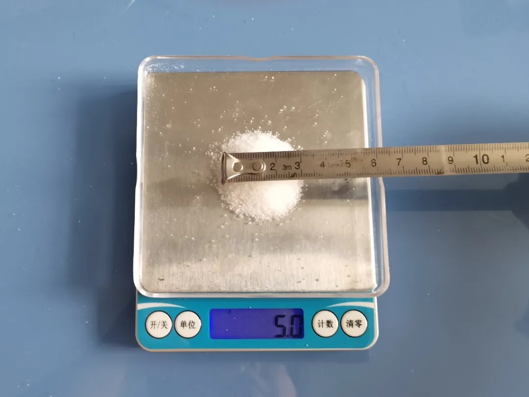 △散开的5克盐,直径比1元硬币大一点