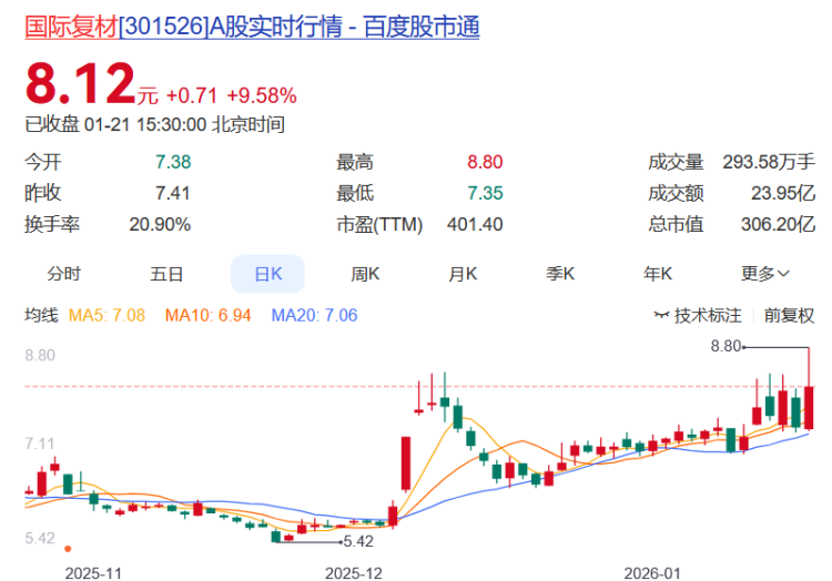 国际复材报收8.12元,日涨幅9.58%,列第二,换手率20.90%,今年以来的涨幅为16.00%。