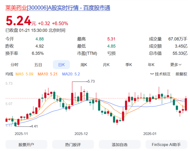 莱美药业报收5.24元,日涨幅6.50%,列第三,换手率6.35%,今年以来的涨幅为1.95%。