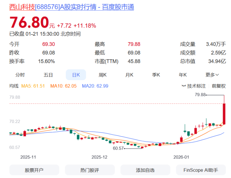 西山科技报收76.80元,日涨幅11.18%,列第一,换手率15.60%,今年以来的涨幅为21.98%。